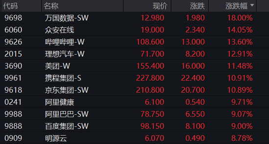港股科技和互联网股尾盘集体拉升,使得恒生科技指数收盘涨幅高达7.66%,万国数据-SW、众安在线、哔哩哔哩-W、理想汽车-W、美团-W、携程-S、京东集团-SW等股票收盘涨幅均超过10%。