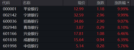 银行板块亦大幅上涨,平安银行、宁波银行双双涨停,招商银行大涨超过9%。