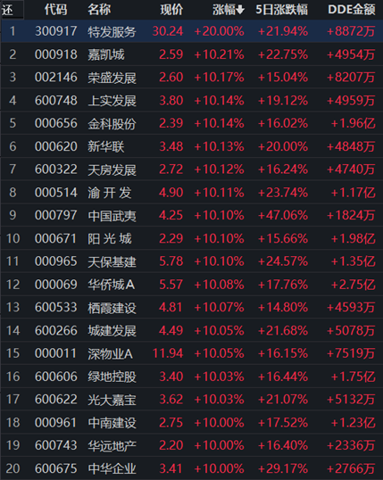 11月29日,申万一级行业中房地产行业领涨,涨幅达7.96%,获得40.15亿元大单资金的净流入,居资金流入行业第4位。行业中115只交易中的个股,全线上涨,其中,82只个股涨幅超5%。