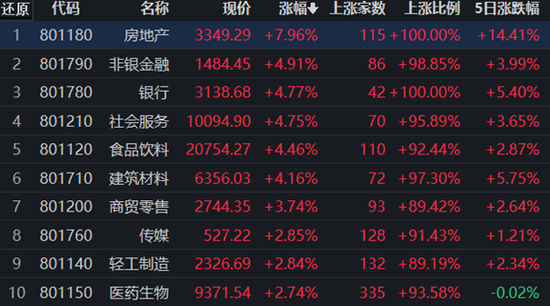 31类申万一级行业中,有30类上涨,其中,房地产涨幅达7.96%,居首,非银金融和银行紧随其后;下跌方面,仅公用事业下跌,跌幅0.49%。