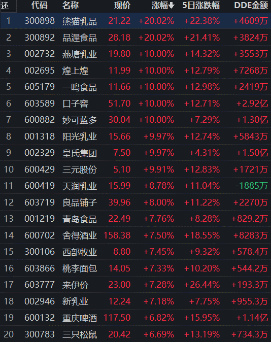 12月1日,申万一级行业中食品饮料行业领涨,涨幅达3.27%,获得29.69亿元大单资金的净流入,居资金流入行业第1位。行业中119只交易中的个股,有112只上涨,其中,37只个股涨幅超5%。