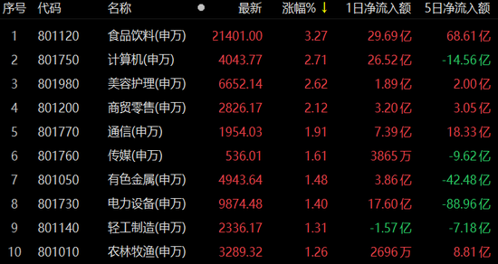 31类申万一级行业中,有26类上涨,其中,食品饮料涨幅达3.27%,居首,计算机、美容护理和商贸零售紧随其后,涨幅均超2%;下跌方面,煤炭居首,跌幅达1.10%。