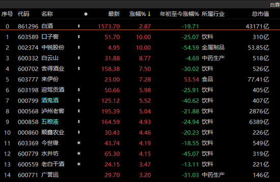 口子窖、中锐股份涨停,白云山涨近9%,舍得酒业、酒鬼酒、泸州老窖也都出现较大涨幅。
