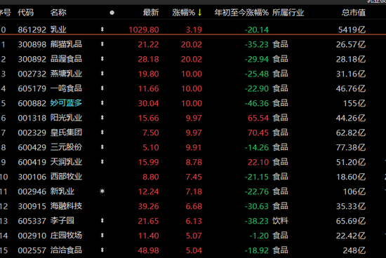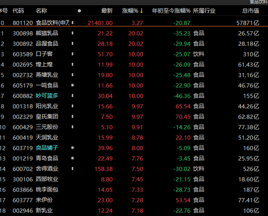 熊猫乳品、品渥食品均“20cm”涨停,口子窖、煌上煌、妙可蓝多等个股也涨停。贵州茅台收涨1.99%报1630.8元/股,五粮液收涨4.93%报164.59元/股,海天味业收涨5.32%报74.1元/股。