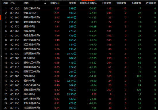 大消费板块信心明显提振,股价大涨,掀起涨停潮。食品饮料板块领跑,涨幅超过3%;美容护理、商贸零售、传媒板块涨幅靠前。计算机、通信、电力设备等科技成长板块也表现不错。