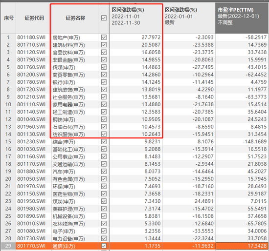 11月,A股蓝筹股备受资金喜爱,这也是沪市跑赢深市的主要原因。从板块上看,“三支箭”已射出,房地产持续回暖,11月份板块大涨近28%,年内跌幅缩至2%。食品饮料、传媒、商业贸易也有明显回暖。