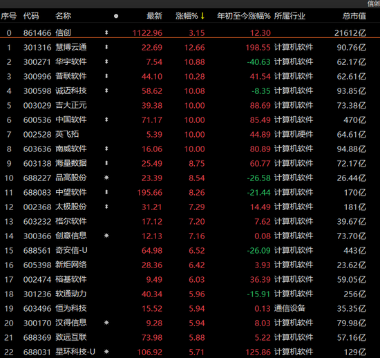 信创概念涨幅超过3%,吉大正元、中国软件、英飞拓、南威软件涨停,金山办公收涨3.99%报265.98元/股,中兴通讯、海光信息均涨约3%,恒生电子、科大讯飞、用友网络涨幅均超过2%。