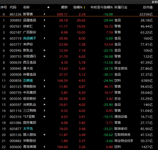 徐家汇、广百股份均涨停,良品铺子、来伊份、新乳业涨幅超过7%。