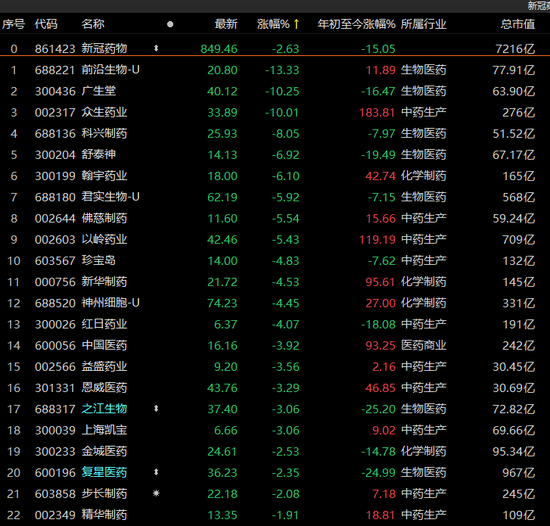 新冠药物概念跌近3%,众生药业开盘大跌不久后跌停,收报33.89元/股。科兴制药跌逾8%,复星医药收跌2.35%报36.23元/股,以岭药业、君实生物均跌逾5%。
