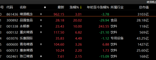 重庆啤酒涨近7%,青岛啤酒、惠泉啤酒、珠江啤酒涨幅均超过2%。
