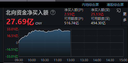 北向资金继续大幅净买入,半天净买入额超过27亿元。