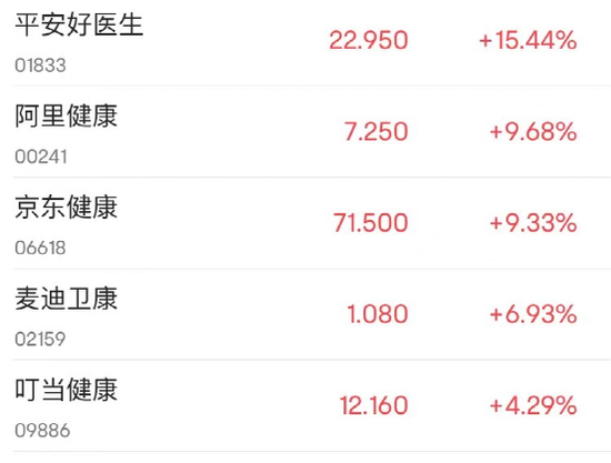 截至收盘,平安好医生涨超15%,盘中一度涨近20%;阿里健康涨近10%,京东健康涨超9%,麦迪卫康涨近7%,叮当健康涨超4%。