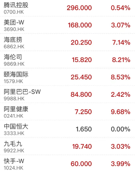盘面上,互联网医疗股爆发,平安好医生涨超15%,阿里健康涨近10%;餐饮股走强,海伦司涨超8%,海底捞、呷哺呷哺涨超7%;科技股集体上涨,美团涨超3%,快手涨近4%,阿里巴巴涨超2%,腾讯微涨不足1%。