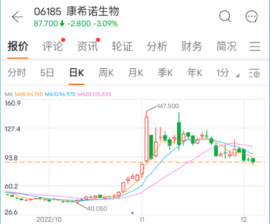 大市向好背景下,前期疫苗龙头康希诺12月5日下跌3%,一度跌破11月初上涨的支撑位。