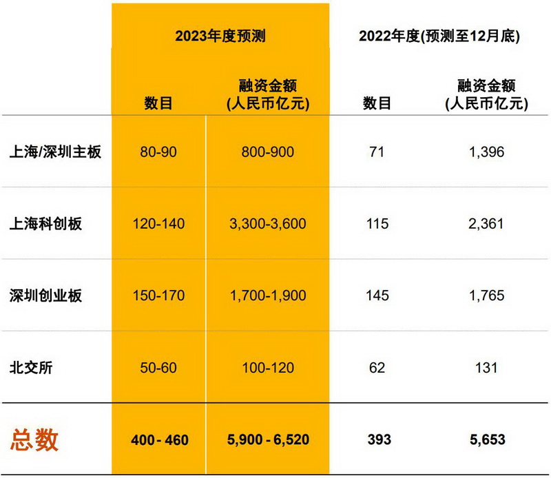 “2022年A股IPO融资额位居全球股市之首,这得益于中国经济的韧性、众多科技企业的脱颖而出,以及鼓励已在境外上市的大型红筹公司回归A股。”普华永道中国北部审计主管合伙人王崧表示,随着更多刺激经济措施的推行落实及宏观政策对提升企业直接融资的推动,普华永道预计2023全年A股市场IPO数量将达400~460家,全年融资额有望再创新高,达到5900亿~6520亿元。