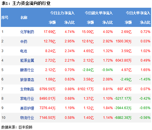 从两市行业板块资金流向来看,化学制药板块获主力资金净流入17.69亿,中药板块获主力资金净流入12.76亿,电池板块主力资金净流入8.24亿,能源金属板块主力资金净流入2.72亿,酿酒板块主力净流入2.12亿。