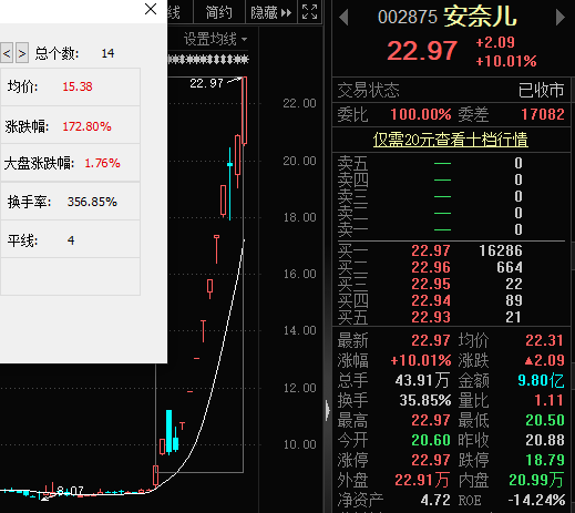 抗病毒面料龙头安奈儿今日再度涨停,最近的14个交易日中该股已斩获10板。安奈儿成立于2001年,中高端童装为其主营业务,虽然其2022年以来已净亏损1.54亿元,仍被其布局不到半年且并未量产的抗病毒面料这一热门概念点燃行情。