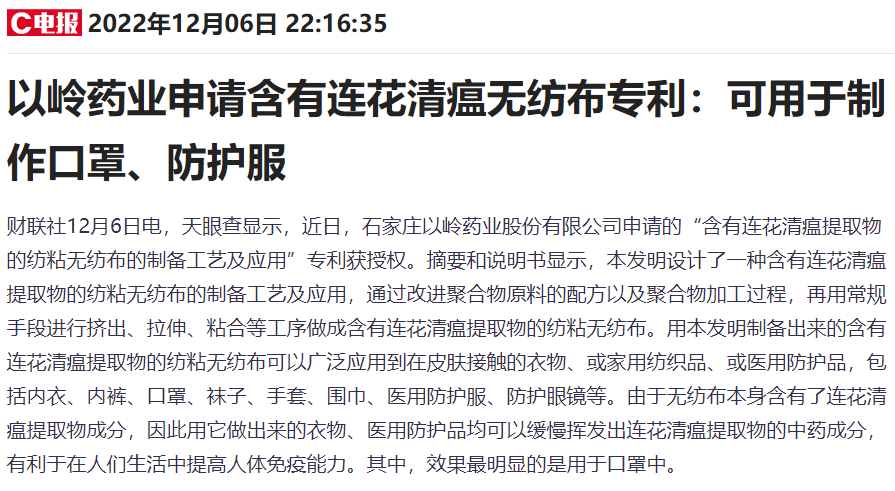 无独有偶,近期主营产品连花清瘟热销,以岭药业不失时机的又推出了新的连花清瘟副产品:含连花清瘟提取物的无纺布,可用于制作口罩、防护服。