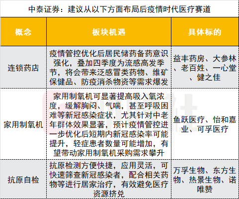 日前各地持续优化疫情防控措施,中泰证券就曾建议积极布局防疫工具+疫后修复两大主线。其认为,考虑到国内人均医疗资源与海外相比仍显不足,前端预防以及轻症/无症状的自我诊疗更加凸显重要性。且防疫投资主线有望持续相当时间。除了口罩、防护服等防护用具外,中泰证券还看好连锁药店、家用制氧机、抗原自检等与防疫相关的投资机会: