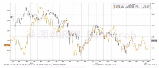 截止11月15号的走势,(二者)基本上非常接近,前面2021年这一段稍微有一些偏离,但它运行的方向是一致的。如果这样就要想一下,为什么我们现在看到的市场走势,跟2013、2014年的走势有很大的雷同?