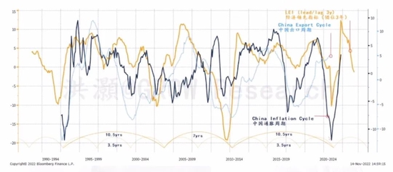这张图里我们对比了三个周期,蓝色虚线是中国的出口周期,深蓝色线是中国的通胀周期,宏观通胀趋势或者中国利润率周期。