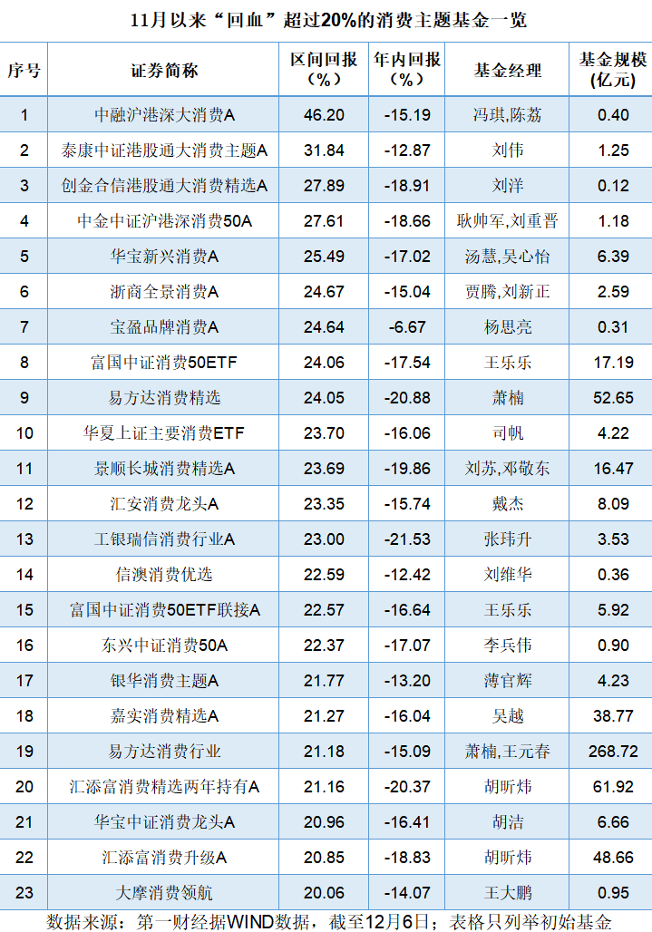 具体而言,涨幅最高的是冯琪和陈荔共同管理的中融沪港深大消费A/C,11月以来累计净值增长率均为46.2%;在区间涨幅均超过20%的产品中,萧楠管理的易方达消费精选、吴越管理的嘉实消费精选A、胡昕炜管理的汇添富消费精选两年持有A等产品均在其中。