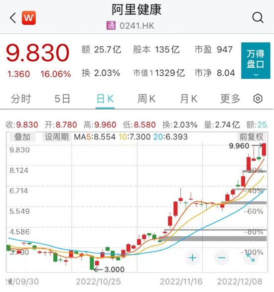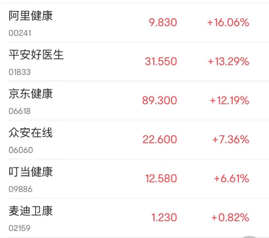 截至收盘,阿里健康涨超16%,创52周新高;平安好医生涨超13%,京东健康涨超12%,众安在线涨超7%,叮当健康涨6.61%,麦迪卫康跟涨。