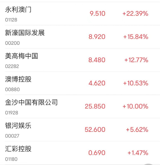 博彩股今日强势,截至收盘,永利澳门涨超22%,新濠国际涨超15%,美高梅中国涨超12%,金沙中国、澳博控股涨超10%。