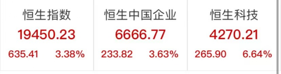 截至收盘,恒生指数收涨3.38%,涨635.41点,报19450.23点;恒生科技指数涨6.64%,报4270.21点;恒生国企指数涨3.63%,报6666.77点。