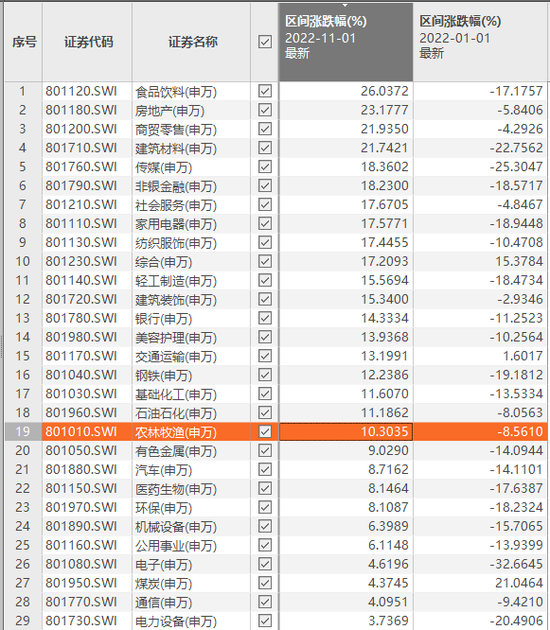 具体来看,在估值吸引及疫情政策优化利好下,食品饮料11月以来回暖幅度超过26%,商贸零售、传媒板块紧随其后。“三支箭”重磅落地,房地产板块也是表现振奋,期间回暖逾23%。