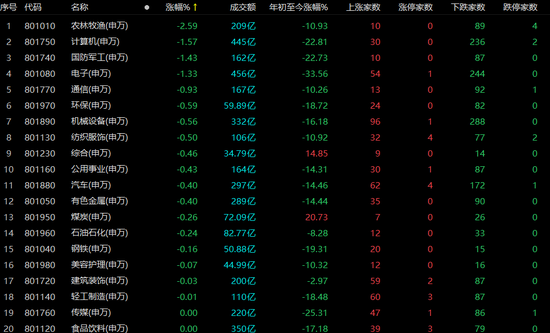 农林牧渔板块收跌2.59%,计算机、国防军工、电子、通信紧随其后。备受关注的电力设备、医药生物、食品饮料板块整体表现平淡。