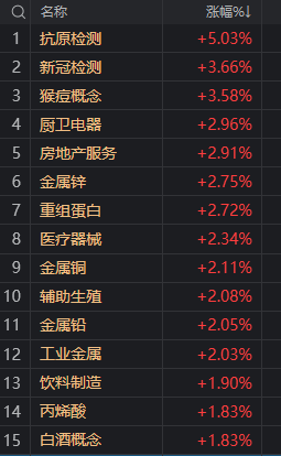 板块方面,抗原检测、新冠检测等板块涨幅靠前,食品饮料板块午后也受资金追捧,庄园牧场、青岛食品、国投中鲁(维权)、桂发祥等多股涨停,口子窖涨超9%,老白干酒、洋河股份、迎驾贡酒均大幅走高。