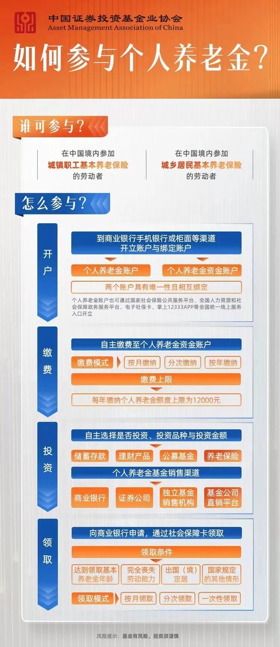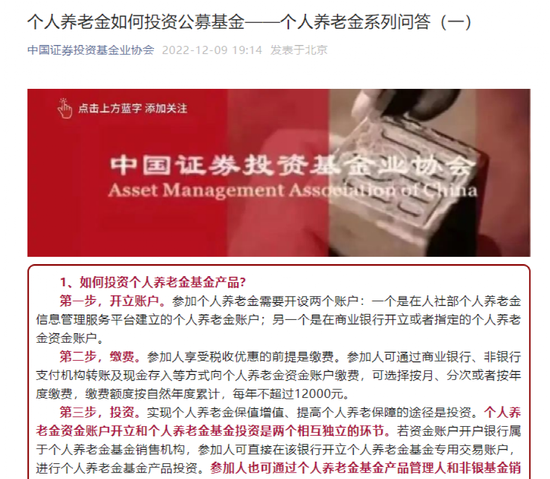 12月9日,中国证券投资基金业协会(以下简称“协会”)发布“个人养老金系列问答”,开展个人养老金投教工作,可谓个人养老金投资公募基金的“官方攻略”。在个人养老金落地实施阶段,协会鼓励基金管理人和销售机构更好服务投资者,推动养老金第三支柱的高质量发展。