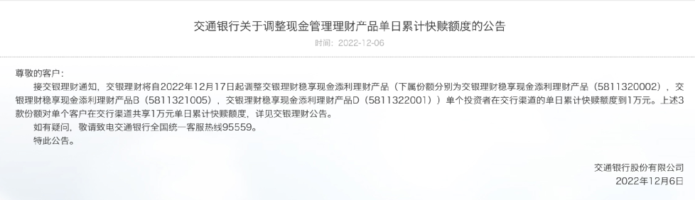 12月6日,交通银行发布公告,交银理财将自2022年12月17日起调整其稳享现金添利理财产品单个投资者在交行渠道的单日累计快赎额度调到1万元,该产品下属3款份额对单个客户在交行渠道共享1万元单日累计快赎额度。