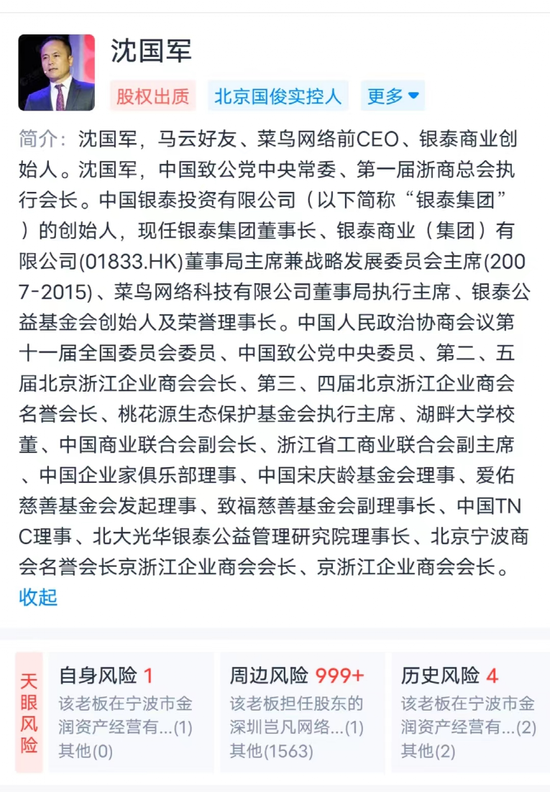 对于银泰系创始人沈国军,天眼查App的资料显示,沈国军为马云好友、菜鸟网络前CEO、银泰商业创始人;中国银泰投资有限公司(以下简称“银泰集团”)的创始人,现任银泰集团董事长、银泰商业(集团)有限公司(01833.HK)董事局主席兼战略发展委员会主席(2007-2015)、菜鸟网络科技有限公司董事局执行主席、银泰公益基金会创始人及荣誉理事长。