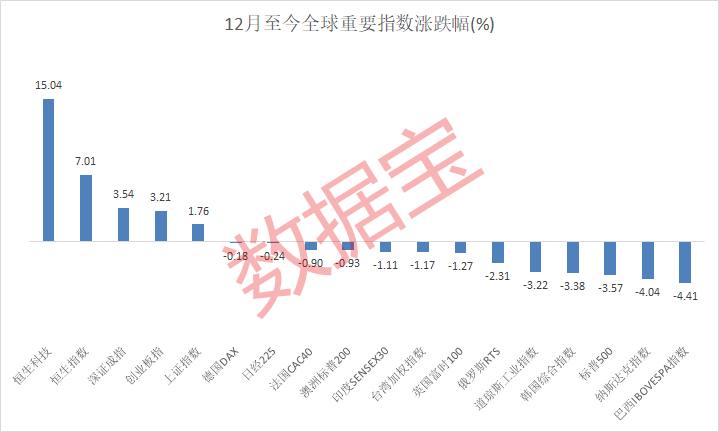 12月以来,A股延续震荡上行态势。沪指累计上涨1.76%;深成指涨3.54%;创业板指涨3.21%。港股表现优异,恒指上涨7.01%,恒生科技大涨15.04%。值得注意的是,A股和港股指数是为数不多录得涨幅的全球重要指数,同期美股、日韩以及部分欧洲市场指数均呈现回调。