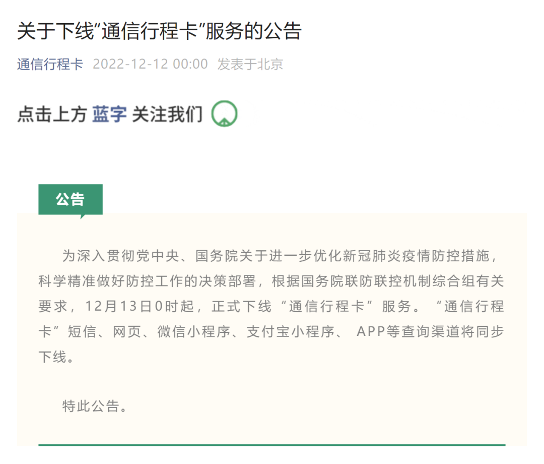 据公众号“通信行程卡”消息,为深入贯彻党中央、国务院关于进一步优化新冠肺炎疫情防控措施,科学精准做好防控工作的决策部署,根据国务院联防联控机制综合组有关要求,12月13日0时起,正式下线“通信行程卡”服务。“通信行程卡”短信、网页、微信小程序、支付宝小程序、APP等查询渠道将同步下线。