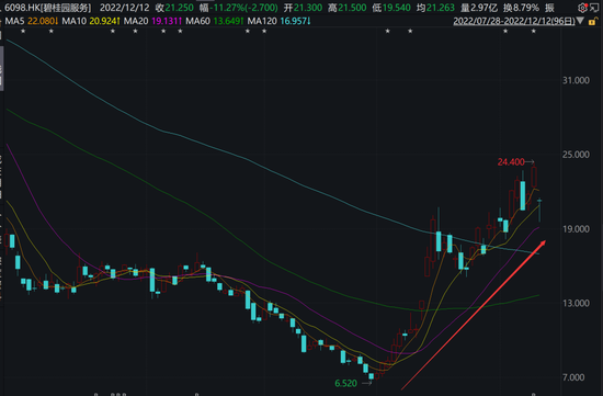 不过从11月以来,房地产市场融资松绑,在南向资金的加持下,碧桂园服务股价迎来持续回弹,从10月31日的最低点6.52港元,涨至12月9日的24.4港元,股价涨了近4倍。