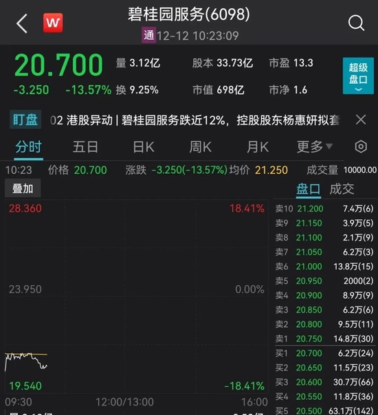 12日早盘,港股碧桂园服务开盘快速下挫,截止发稿,跌近14%,跌破700亿市值。