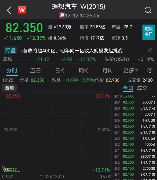 12日早盘,理想跳空低开,截至发稿,跌超12%。