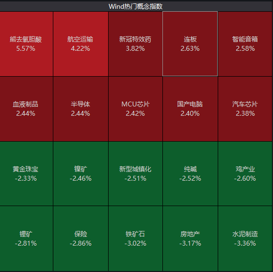 截至午间收盘,概念股中,涨幅居前的大多数股票来自医药板块,熊去氧胆酸概念领涨,新华制药4连板,多瑞医药、精华制药、盘龙药业涨停,宣泰医药、上海凯宝涨超14%。半导体板块拉升走强,国资云、信创概念股拉升,民航机场板块整体走强;房地产、铁矿石、水泥、油气管网等板块领跌。