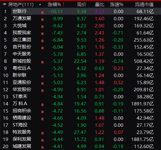 今天地产股是下跌首要板块,行业跌幅3.26%,位居各行业之首。世联行、万通发展跌停,大悦城逼近跌停,万科A大跌近5%,保利发展也跌超4%。