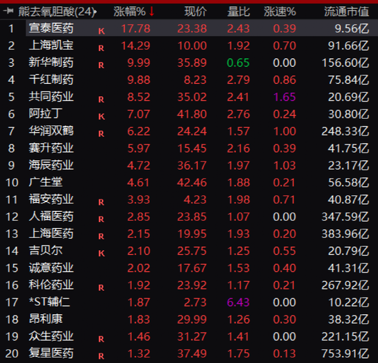 地产股和市场普遍下挫,新冠相关的熊去氧胆酸概念股板块涨势凶猛。A股熊去氧胆酸概念股指数大涨4.71%,宣泰医药大涨近18%,上海凯宝涨超14%,新华制药A股涨停。