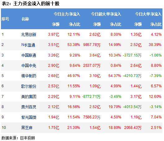 从两市个股主力资金流向来看,兆易创新获主力资金净流入3.97亿,N长盈通获主力资金3.51亿净流入,中国联通获主力资金净流入3.26亿,中国中免获主力资金净流入2.90亿,精华制药获主力资金净流入2.68亿。