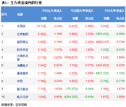 从两市行业板块资金流向来看,半导体板块获主力资金净流入13.71亿,化学制药板块获主力资金净流入5.48亿,医药商业板块主力资金净流入3.58亿,软件开发板块主力资金净流入3.14亿,计算机板块主力净流入2.11亿。