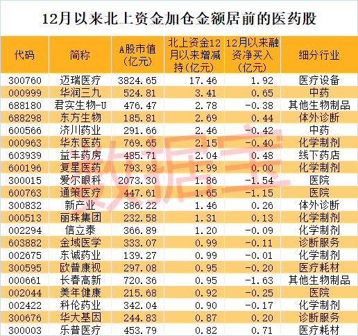 资金面上,12月以来北上资金加仓医药生物行业58.73亿元。同期,医药生物行业获融资资金加仓19.6亿元,排在行业第一位。单只股票来看,按照区间成交均价计算,12月以来北上资金加仓超亿元的有13只,如迈瑞医疗、华润三九、君实生物-U、东方生物、济川药业等。在此期间,融资资金同时加仓逾亿元的仅迈瑞医疗,两大资金合计加仓约19亿元,该股是医疗器械龙头,最新A股市值3825亿元。