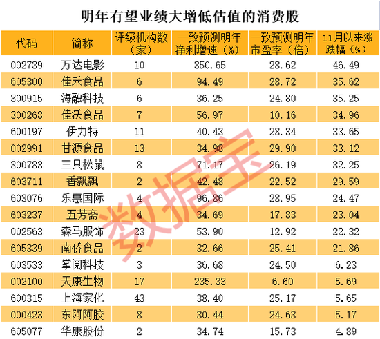 明年消费板块有望复苏。根据机构一致预测,大消费板块中有18只个股明年净利增速超过30%且市盈率低于30倍。从估值来看,数据宝统计显示,天康生物机构一致预测明年市盈率不到7倍,佳沃食品、森马服饰、华康股份、五芳斋等个股低于20倍。从二级市场表现来看,榜单中牛股成群,万达电影11月以来累计涨幅超46%居首,佳禾食品、海融科技、佳沃食品、伊力特等个股涨逾30%。