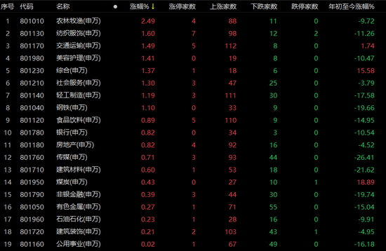 大消费板块走强,科技股走弱。农林牧渔板块领跑,涨幅接近2.5%,佳沃食品“20cm”涨停。纺织服装、交通运输、美容护理、社会服务、轻工制造、食品饮料板块均表现不错。