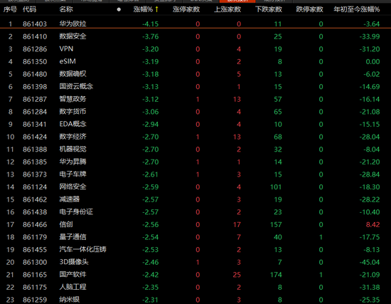 但华为欧拉、数字经济、信创、汽车一体化压铸、麒麟电池、芯片等相关概念跌幅较大。