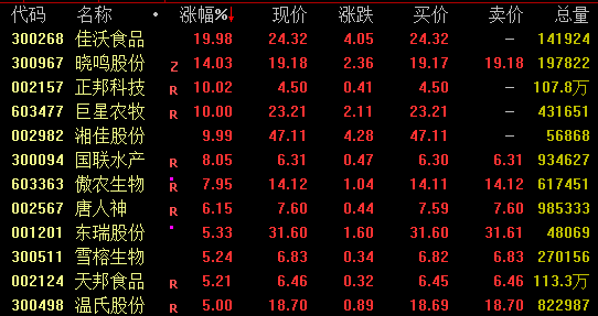 农业板块盘中强势拉升,鸡肉、猪肉、水产类股均有所表现。截至收盘,鸡肉股方面,晓鸣股份大涨14%,华统股份、广弘控股涨停;猪肉股方面,正邦科技、巨星农牧、湘佳股份等涨停,得利斯、唐人神涨超6%,温氏股份涨5%,牧原股份涨2%;水产股方面,佳沃食品“20cm”涨停,国联水产涨超8%。